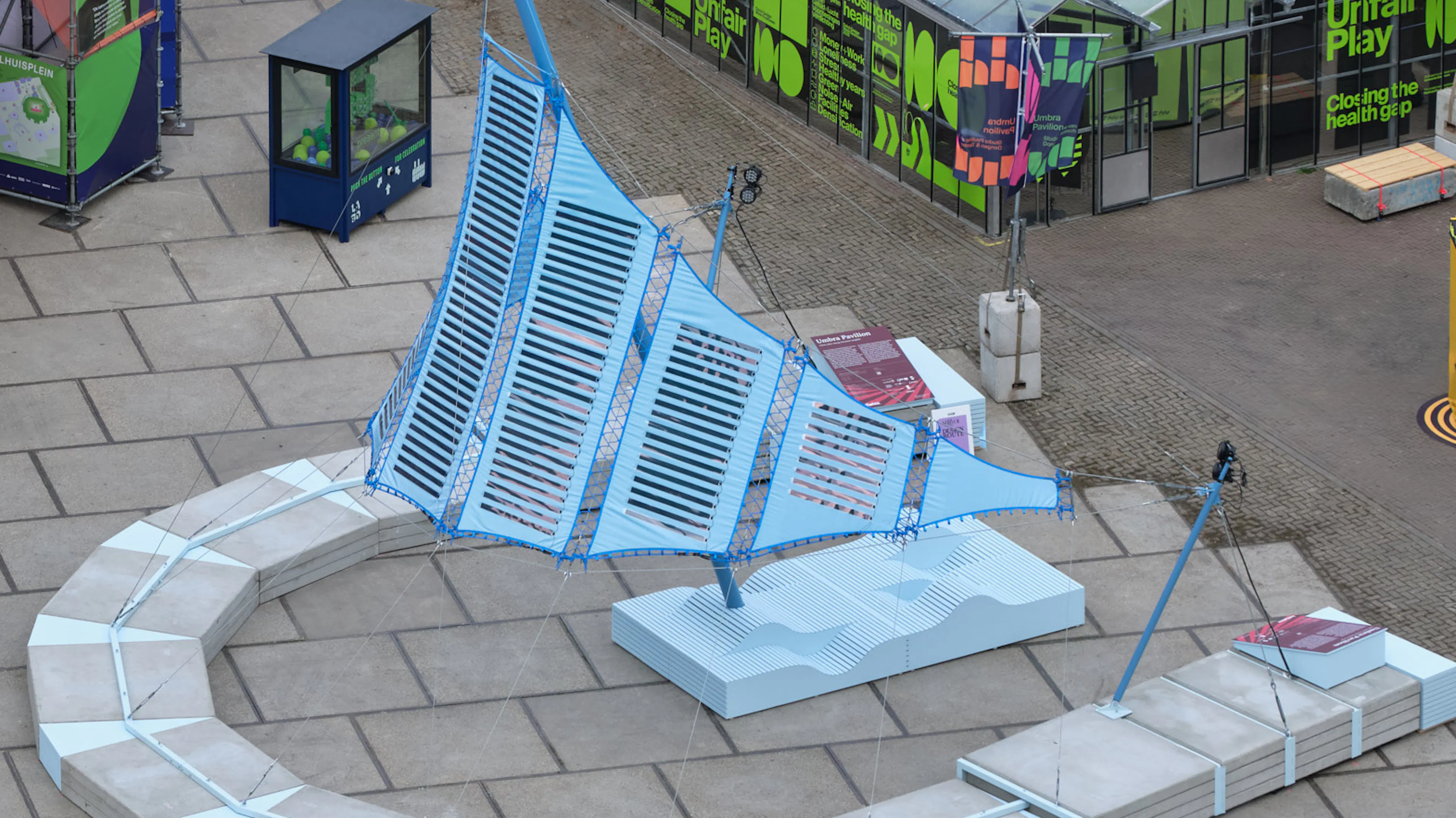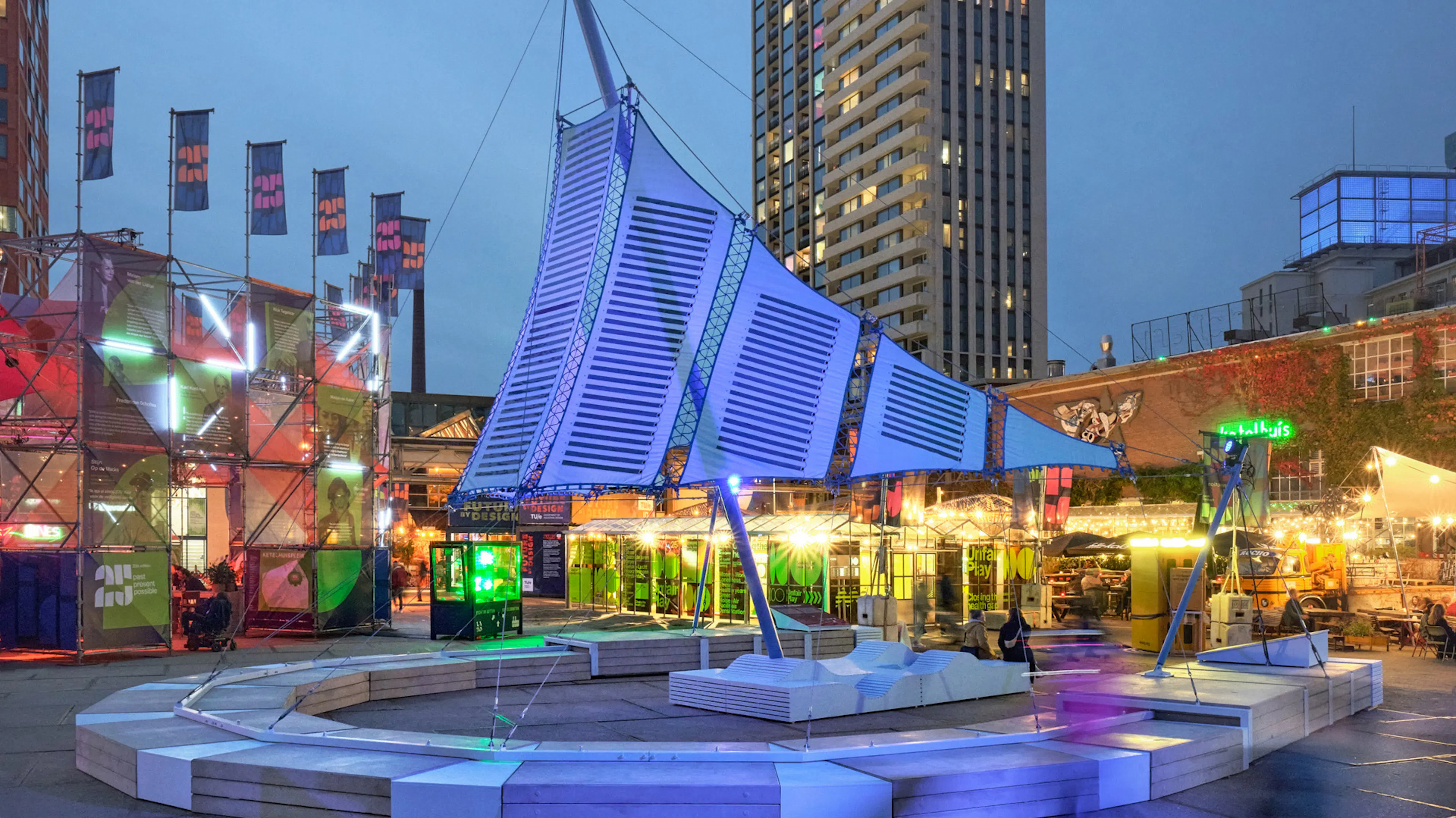 Developed by Studio Pauline van Dongen in collaboration with Tentech, heliotex is applied at architectural scale for the first time in the Umbra Pavilion. Rising like a floating canopy, it offers shade by day and glows with stored solar energy by night—demonstrating how design can integrate renewable energy seamlessly into everyday life.